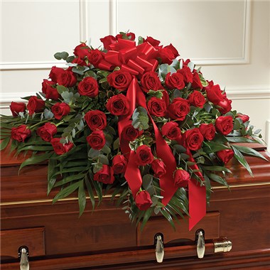 •Half casket cover arrangement of red roses and fresh greenery; accented with a red satin ribbon